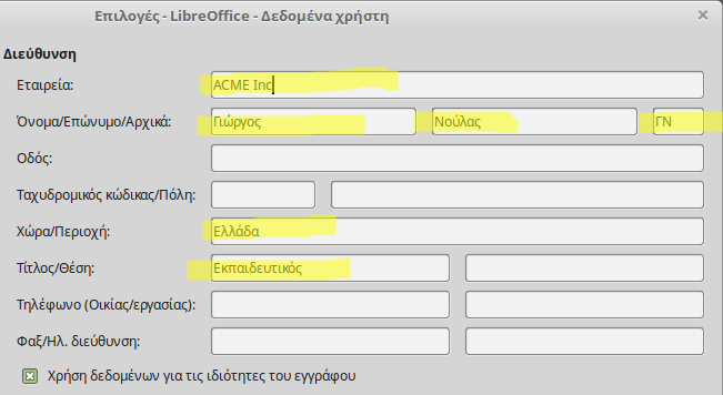 Σε αυτή την άσκηση θα πρέπει να συμπληρώσετε τις επιλογές Δεδομένων Χρήστη και να αλλάξετε τις Τοπικών υθμίσεεις στο LibreOffice. Ανοίξτε πρώτα το παράθυρο διαλόγου Επιλογές από το μενού Εργαλεία > Επιλογές.