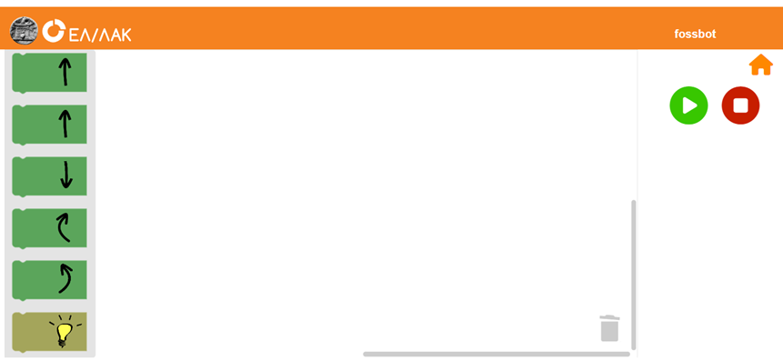 - Και στο FossBot Simulator εφόσον θέλετε να ξανατρέξετε το πρόγραμμα θα πρέπει να διαγράψετε τον κώδικα (με το σύρε και άφησε στο εικονίδιο με τον κάδο) και στη συνέχεια να γράψετε τον κώδικα επιλέγοντας και πάλι Τρέξε το πρόγραμμα! (πράσινο βελάκι).