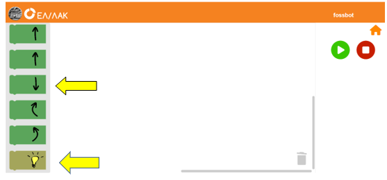 - Και στο FossBot Simulator εφόσον θέλετε να ξανατρέξετε το πρόγραμμα θα πρέπει να διαγράψετε τον κώδικα (με το σύρε και άφησε στο εικονίδιο με τον κάδο) και στη συνέχεια να γράψετε τον κώδικα επιλέγοντας και πάλι Τρέξε το πρόγραμμα! (πράσινο βελάκι).