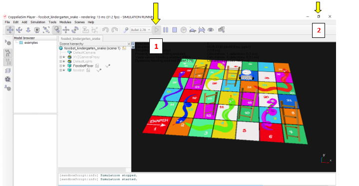 - Επιλέγετε Start/ resume simulation (1) και στη συνέχεια επιλέγετε το παράθυρο σε Επαναφορά (2) ώστε να υπάρχει χώρος στην οθόνη σας για να βλέπετε και το προγραμματιστικό περιβάλλον.