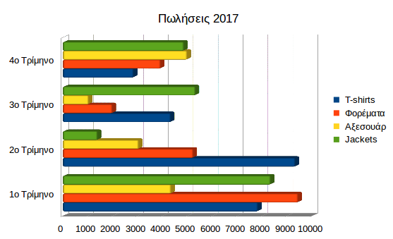 2. Δημιουργήστε ένα διάγραμμα ράβδων που περιλαμβάνει όλα τα δεδομένα. Χρησιμοποιήστε την επιλογή 3D και τοποθετήστε τον τίτλο "Πωλήσεις 2017".