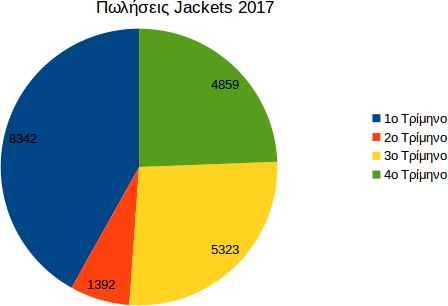 3. Δημιουργήστε ένα διάγραμμα πίτας. Το διάγραμμα θα πρέπει να περιέχει μόνο τη σειρά δεδομένων για το είδος Jackets. Επομένως, στο Βήμα 3 του Οδηγού Χάρτη πρέπει να καταργήσετε τις άλλες σειρές δεδομένων. Επίσης εισάγετε και ετικέτες δεδομένων με την εντολή Εισαγωγή ετικετών δεδομένων. Τέλος προσθέστε τον τίτλο "Πωλήσεις Jackets 2017".