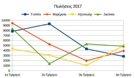 4. Δημιουργήστε ένα γράφημα γραμμών με σημεία και γραμμές που περιλαμβάνουν όλα τις σειρές δεδομένων. Τοποθετήστε τον Υπόμνημα στην κορυφή. Εισαγάγετε τον τίτλο "Πωλήσεις 2017".