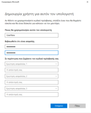 6. Στην επομένη οθόνη συμπληρώσετε τα στοιχεία του νέου χρήστη, δίνοντας όνομα UserNew, συνθηματικό “usernew” και απαντώντας στις παρακάτω ερωτήσεις που εμφανίζονται.