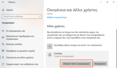 3. Στην επιλογή «Άλλοι χρήστες» πατήστε πάνω στο όνομα Χρήστη που θέλετε να αλλάξετε τον τύπο του. Πατήστε στη συνέχεια «Αλλαγή τύπου λογαριασμού».