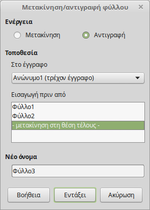 Μπορείτε να μετακινήσετε ή να αντιγράψετε φύλλα εντός του ίδιου υπολογιστικού φύλλου είτε με σύρσιμο και απόθεση είτε με παράθυρο διαλόγου Μετακίνηση / Αντιγραφή φύλλου. Για να μετακινήσετε ή να αντιγράψετε ένα φύλλο σε ένα άλλο αρχείο υπολογιστικού φύλλου, πρέπει να χρησιμοποιήσετε το παράθυρο διαλόγου Μετακίνηση / Αντιγραφή φύλλου. Για να εμφανίσετε το παράθυρο διαλόγου Μετακίνηση / Αντιγραφή φύλλου κάντε δεξί κλικ σε ένα φύλλο και επιλέξτε την εντολή Μετακίνηση/αντιγραφή φύλλου από το μενού περιβάλλοντος. Σε αυτό το παράθυρο διαλόγου μπορείτε να ορίσετε τα εξής: