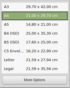 Every document in a text editing application must have defined a paper size. Paper sizes ares standardized according to the A series ISO sizes. The most common paper size used around the world is A4, which is 210mm x 297mm. A4 is the default paper size in Writer and the size that all printers support. Some printers support the larger A3 size.