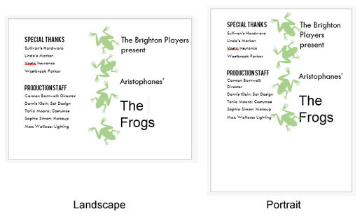 Writer offers two page orientation options: landscape and portrait. Landscape means the page is oriented horizontally, while portrait means the page is oriented vertically. See how orientation can affect the appearance of a page in the image below.