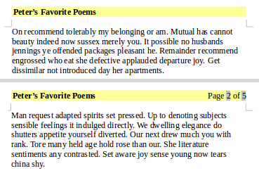 There are a lot of interesting variations that you can apply in a header or footer using page number fields and text. For example to achieve a header like the following example