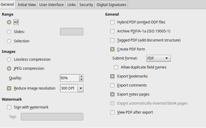 - Images: You can adjust the compression and quality of images inside the presentation. This is useful when you want to reduce the file size of the pdf file.
