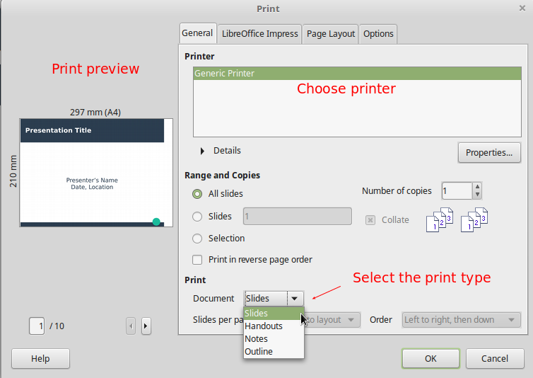Impress provides many options for printing a presentation. Some of these options are identical to when printing documents (printer, range and copies, pages per sheet). To print a presentation click on the print button