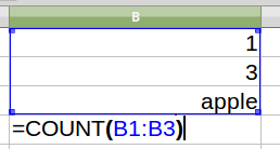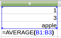 where cells B1, B2, B3 contain 1, 3, and apple returns 2, the average of 1 and 3. Text is ignored.