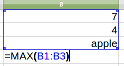 where cells B1, B2, B3 contain 7, 4, and apple returns 7