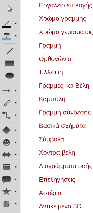 Ορισμένα από τα εικονίδια στη γραμμή εργαλείων Σχεδίασης θα αλλάξουν ανάλογα με το σχήμα που έχει επιλεγεί. Τα εικονίδια με τις παλέτες εργαλείων υποδεικνύονται από ένα μικρό τρίγωνο στα δεξιά του.