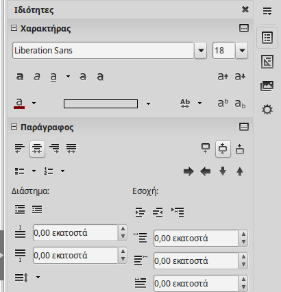 Το κείμενο μπορεί να μορφοποιηθεί από την ενότητα χαρακτήρων και παραγράφων της καρτέλας Ιδιότητες της πλευρικής στήλης.