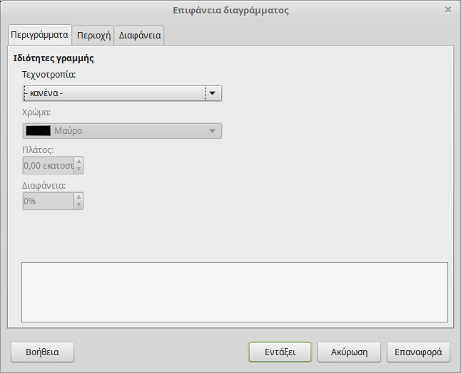 Για να μορφοποιήσετε ένα στοιχείο ενός διαγράμματος, επιλέξτε το από το αναπτυσσόμενο μενού επιλογής στοιχείου και κάντε κλικ στο κουμπί Μορφοποίηση επιλογής. Με αυτό το τρόπο ανοίγει το αντίστοιχο παράθυρο μορφοποίησης όπου μπορείτε να αλλάξετε τις επιλογές όπως για παράδειγμα περιγράμματα, χρώμα περιοχής και διαφάνεια. Στο παράδειγμα της παρακάτω εικόνας φαίνεται το παράθυρο μορφοποίησης του στοιχείου Επιφάνειας διαγράμματος. Εναλλακτικά, μπορείτε να χρησιμοποιήσετε την πλευρική στήλη για να μορφοποιήσετε ένα επιλεγμένο στοιχείο.