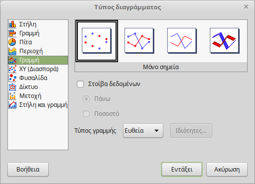 Εμφανίζει τιμές ως σημεία που συνδέονται με μια γραμμή. Αυτό το γράφημα είναι πολύ χρήσιμο όταν θέλουμε να εμφανίσουμε τη μεταβολή ενός μεγέθους με την πάροδο του χρόνου ή άλλη κατηγορία για μία ή περισσότερες σειρές δεδομένων.