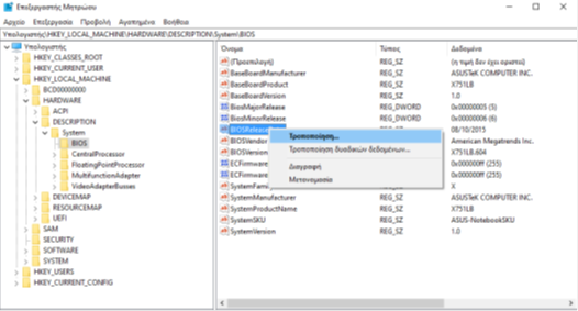 Για να τροποποιήσουμε  την τιμή κάνουμε  δεξί κλικ επάνω στο όνομά της και επιλέγουμε «Τροποποίηση».