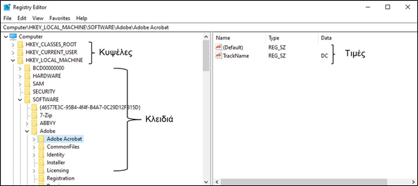 Μια εικόνα της δομής του μητρώου μπορούμε να δούμε από τον Επεξεργαστή μητρώου που θα μελετήσουμε στη συνέχεια.