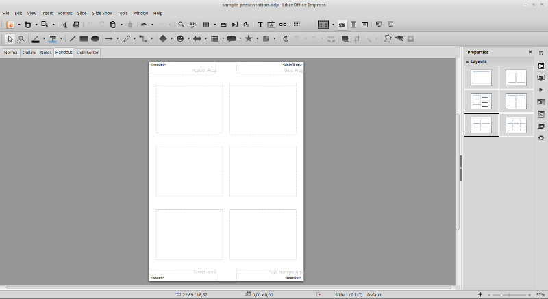 The Handout view is for setting up the layout of your slide for a printed handout. Click the Handout tab in the workspace and the Layouts section opens on the Sidebar. Then you can choose the number of slides per page for the printed handouts.