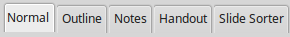 The Workspace has five tabs: Normal, Outline, Notes, Slide Sorter, and Handout. These five tabs are called View buttons. To change a Workspace view: