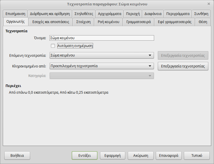 Περιηγηθείτε στις καρτέλες για να αλλάξετε τις επιλογές μορφοποίησης παραγράφων και χαρακτήρων για ένα επιλεγμένο στυλ. Παρατηρήστε στην καρτέλα Οργανωτής ότι ένα στυλ έχει ένα γονικό στυλ από το οποίο κληρονομεί τις ιδιότητες. Ένα στυλ έχει επίσης ένα επόμενο στυλ, το οποίο είναι το προεπιλεγμένο στυλ κατά τη δημιουργία μιας νέας παραγράφου μετά.