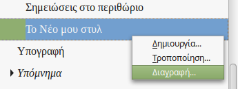 Για να τροποποιήσετε ή να διαγράψετε ένα προσαρμοσμένο στυλ κάντε δεξί κλικ σε ένα στυλ για να ανοίξετε το μενού περιβάλλοντος. Σημειώστε ότι δεν μπορείτε να διαγράψετε προκαθορισμένα στυλ. Με τον ίδιο τρόπο μπορείτε να τροποποιήσετε οποιοδήποτε στυλ στο έγγραφό σας.