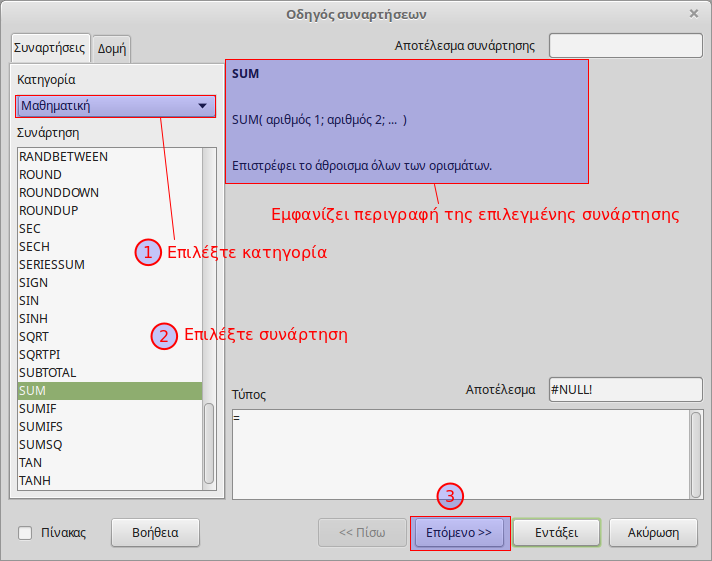 3. Επιλέξτε την κατηγορία συναρτήσεων από την αναδυόμενη λίστα και μετά επιλέξτε τη συνάρτηση που θέλετε να εισάγετε. Στο παράθυρο του οδηγού εμφανίζεται μια σύντομη περιγραφή της επιλεγμένης συνάρτησης και του τρόπου συνταξής της. Κάντε διπλό κλικ στο όνομα της συνάρτησης ή πατήστε το πλήκτρο Επόμενο.