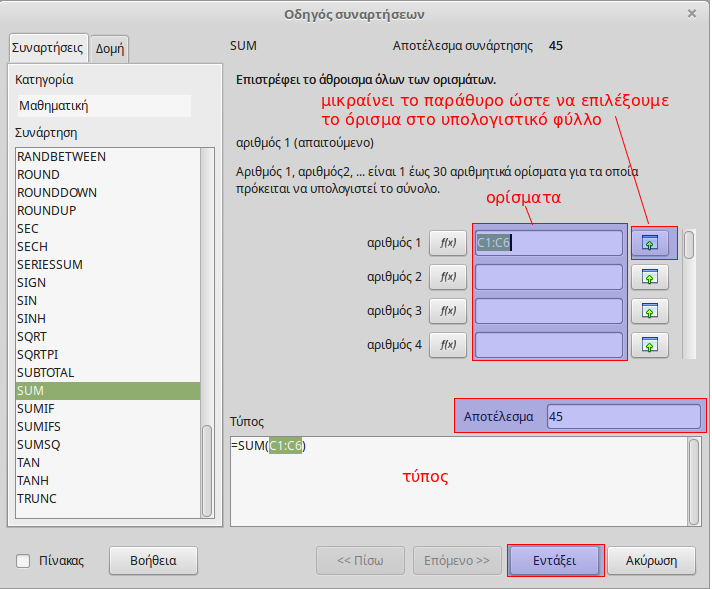 Εισαγωγή συναρτήσεων στο Calc