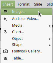 LibreOffice Gallery contains a collection of cliparts you can use in your slides. Browse the Gallery categories to find a clipart and drag it to your slide. The diagrams category contains shapes common diagrams for presentations.
