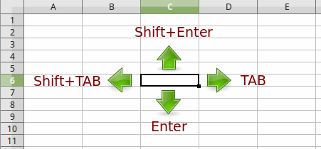 You can navigate to any cell by clicking with the mouse, however you should learn the following navigation shortcuts keys to speed up data entry with Calc.