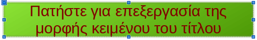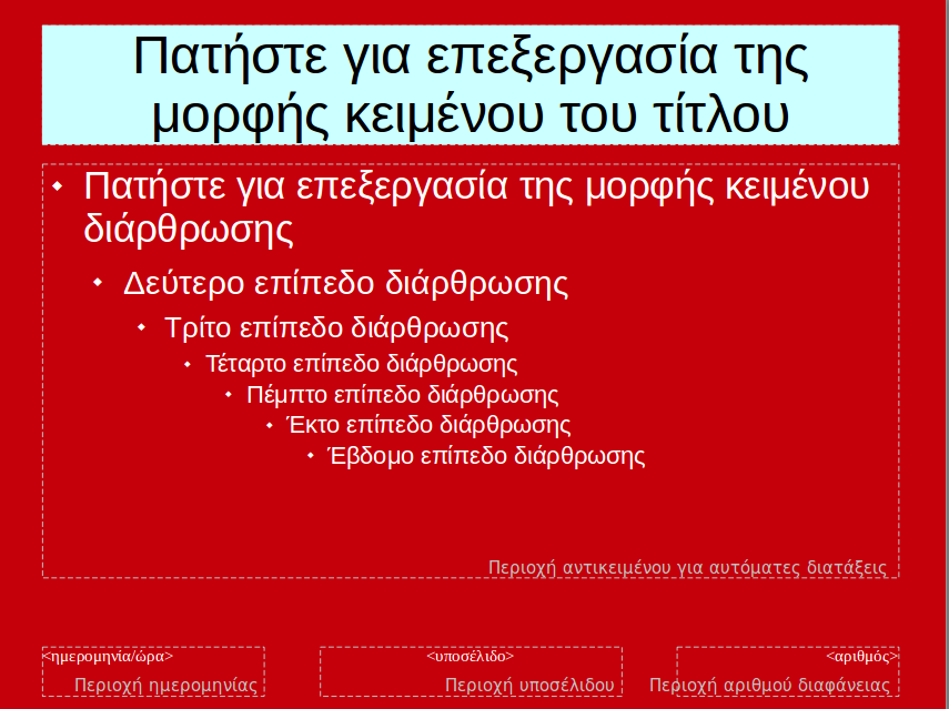 Οι περιοχές ημερομηνία, υποσέλιδο και αριθμού διαφάνειας της κύριας διαφάνειας, εμφανίζουν κείμενο που προέρχεται από συγκεκριμένα αυτόματα πεδία. Για να ενεργοποιησετε και να ρυθμίσετε το κείμενο στα πεδία αυτα.