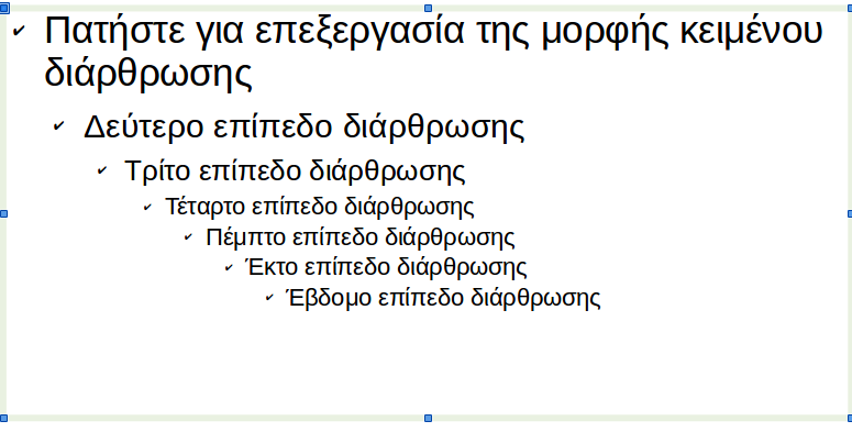 Με παρόμοιο τρόπο μπορείτε να τροποποιήσετε το πλαίσιο κειμένου της περιοχής αντικειμένων. Εδώ για παράδειγμα μπορείτε να αλλάξετε το στυλ κουκκίδων με την εντολή μενού Μορφή > Κουκκίδες και αρίθμηση.