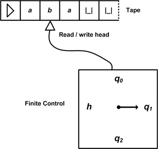 · Μία κεφαλή (read/write head) που μπορεί να διαβάζει και να γράφει σύμβολα πάνω στην ταινία και που μπορεί να μετακινεί την ταινία κατά ένα (και μόνο ένα) κελί κάθε φορά.